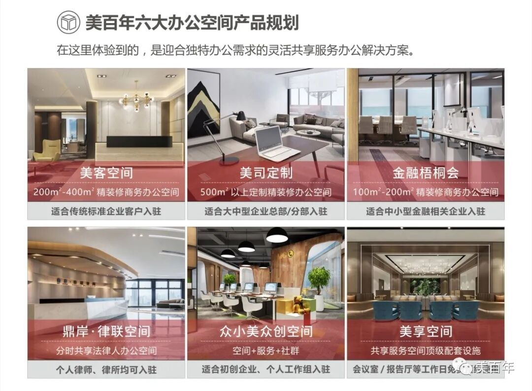 考虑到各类商圈核心需求不同,为更好的满足客户,【美百年】开创独属于金融企业的金融梧桐会,另建设个人律师、律所专享的律联空间。为企业赋能,针对高端商务打造俱乐部会员模式,旨在连接资源与核心商圈,为企业全效办公服务。