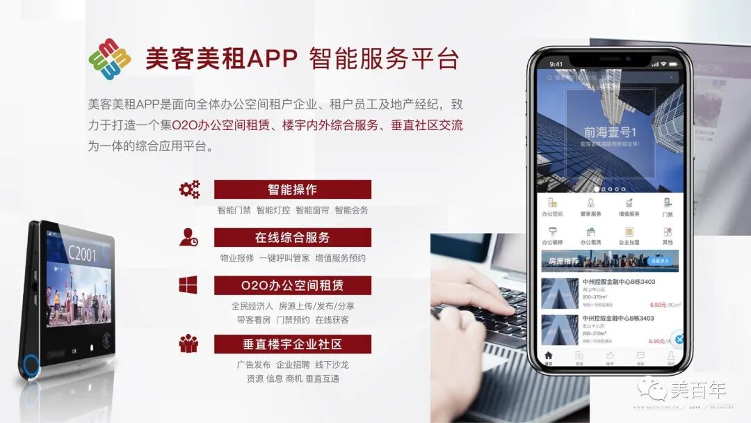 面向全体办公空间租户企业、租户员工及地产经纪,【美百年】跟随智能化浪潮,致力于打造集O2O办公空间租赁、楼宇内外综合服务、垂直社区交流为一体的综合应用交流平台,目前已打造了2款线上智能服务平台 ——美客美租APP、MLOUNGE小程序。