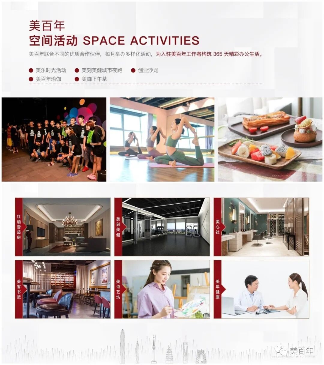在软性赋能方面,【美百年】还从人文化关怀角度着手,联合了不同的优质合作伙伴,在美享空间每月举办多样化活动,为入驻企业发展助力陪跑,提供精彩的办公生活:加速器、俱乐部、创业沙龙、节假日活动、下午茶、城市夜跑等。