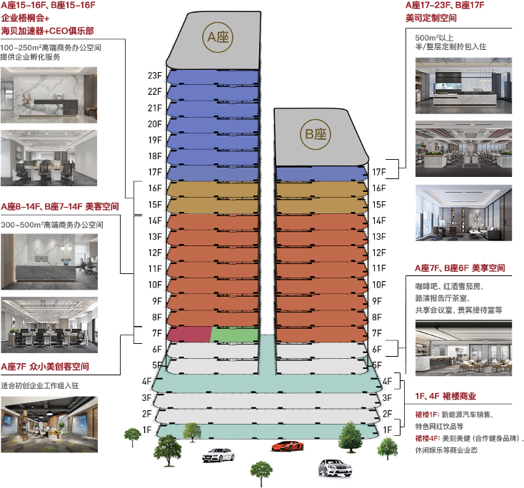 地宝大厦项目是长沙岳麓区新式地标性建筑之一,分A、B两栋双子式造型,业态涵盖甲级写字楼、当代美术馆,拥有地下停车位约300个,停车便捷。美百年依托自身美城新产业、优客美装、优客美租、优客美智、优客美策、优客美服等六大产业生态链条,为长沙地宝大厦AB栋近七万多平方整体提供项目策划与定位、产业导入、公共空间设计与装修、办公空间拎包入住、多业态小型生态体系、楼宇智能信息化改造、管家式物业服务、招商运营等全产业服务。在产品打造方面延续多样化的空间产品运营策略上再做创新,在空间功能、资源赋能、办公体感上,全方位展现高超品质水准,让客户拥有高品质写字楼办公生活,同时美百年针对不同规模企业的不同发展阶段,提供灵活的办公场所租赁组合和租期配置,帮助进驻企业降本增效,打造共享办公服务新高地。