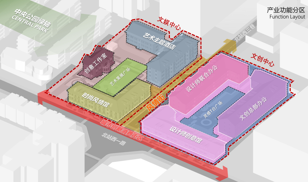 穿越时间,打造融合历史与艺术的魅力街区:时尚艺术商业区、潮乐创意园区、都市文化休闲区,在产业功能分区上,划分为文娱中心、文创中心,通过创新有趣、年轻时尚的设计,打造出区别于市场的特色园区。