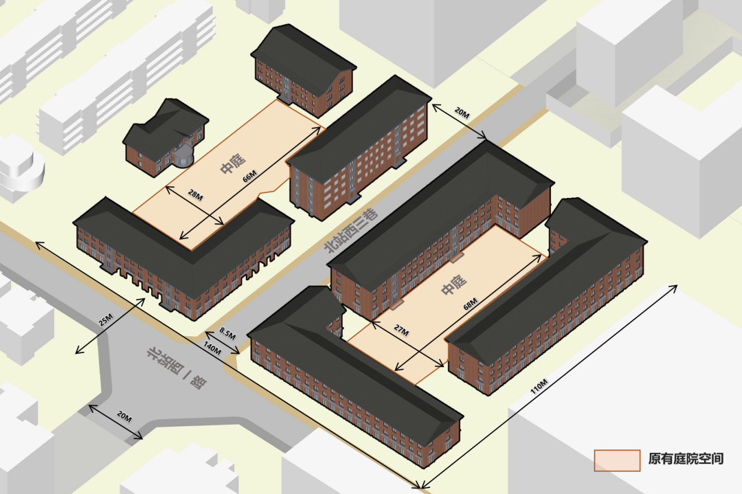 其次是根据双子园原有庭院空间进行分析,在空间尺度上,北站西一路建筑间距较为宽阔,北站西三巷更为亲人,两个内部庭院空间尺度较大,在空间改造时,北园通过新建入口大门、雨棚,以及一层酒店大堂,打造合理建筑过渡空间与形象展示;南园通过新建风雨连廊有机串联原始三栋相对独立的楼宇空间。