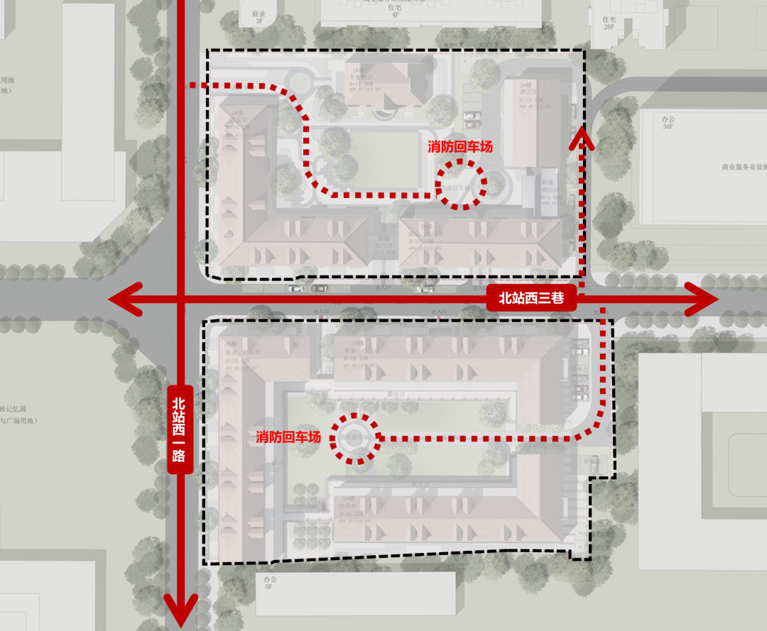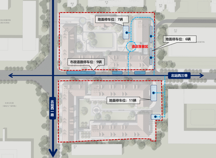 根据现有道路对双子园整体进行系统性的交通优化,区分开放公共空间,慢行街道空间,合理规划慢行系统组织,设置双层人行流线对行人进行分流;规划车行流线,规划路面停车位33处(其中市政道路停车位9辆),其中北园停车位22辆,南园停车位11辆,南北庭院各设两条消防车道及回车场,满足本项目建筑消防规范需求。