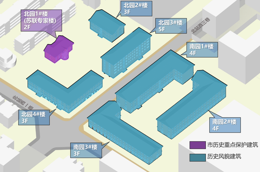 美城新产业研究中心通过明确用地性质及实地考察场地现状后认为,首先要对建筑保护分级,明确双子园苏联专家楼市历史重点保护建筑、其他建筑为历史风貌建筑,除对专家楼进行修缮加固外,其他建筑均实施改造更新。