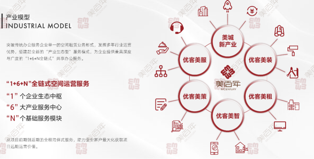 美百年依托17年的行业运营经验,深度把握城市空间市场脉搏,突破传统办公服务单一的空间租赁业务形式,搭建“1+6+N”产业生态型服务模式,通过多维服务模块构建产业服务链条,把握数字化、网络化、智能化的全新趋势,建立产业生态全布局及企业服务的良好生态循环,通过自身美城新产业、优客美装、优客美租、优客美智、优客美策、优客美服等六大产业生态链条,对整个项目独立运营提供项目策划与定位、产业导入、公共空间设计与装修、办公空间拎包入住、多业态小型生态体系、楼宇智能信息化改造、管家式物业服务、招商运营等全产业服务,为业主提供全方位的运营支持。